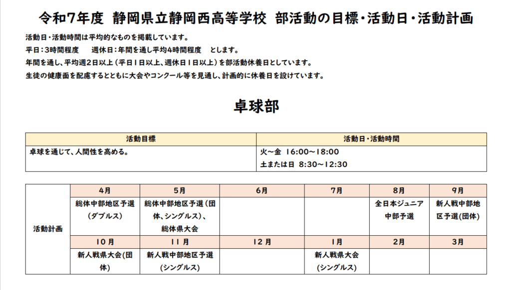 部員たちは、部活動と外部活動(卓球教室/学習塾/ボランティア活動など)の両立を目指して、時間の使い方を工夫しています。以下はその例です。月曜日は部活動は原則オフ日です。週2回の外部活動を認めています。