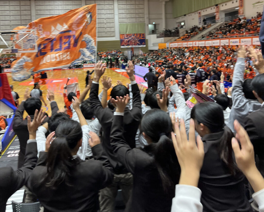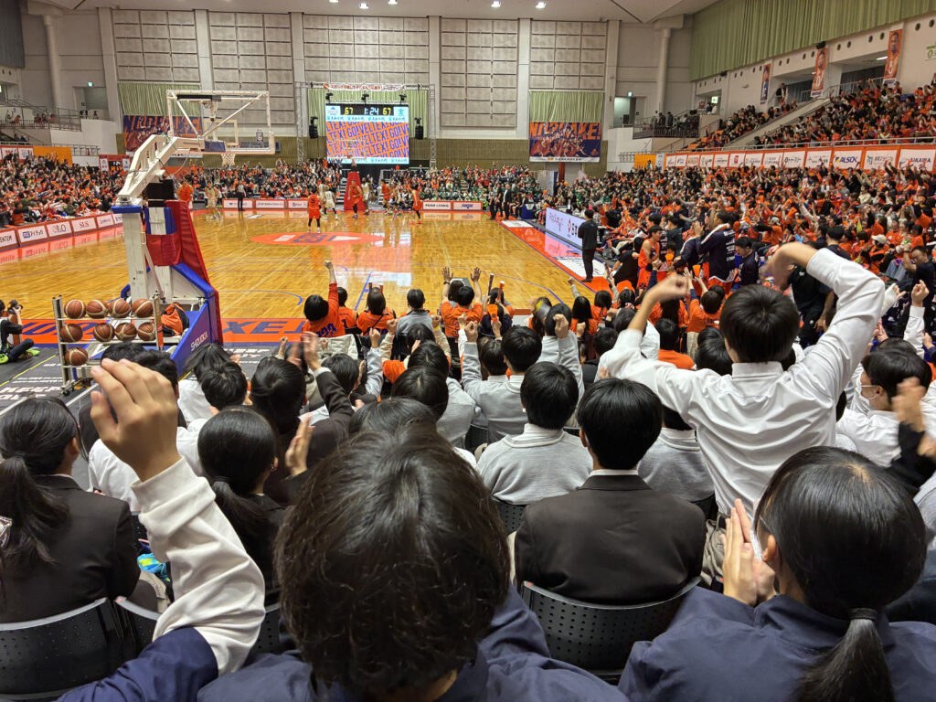 令和7年12月6日(土)にスポーツコース1年生と女子バスケットボール部員が、プロバスケットボールの試合を観戦しました。これは「行きたい学校づくり事業」の取り組みの一つで、スポーツコース1年生に様々な種目においてトップレベルの試合に触れる機会を毎年設けています。今回で4回目の取り組みで、今年度は男子プロバスケットボールB.LEAGUE(Bリーグ)B2リーグ戦 ベルテックス静岡 対 横浜エクセレンスの試合を観戦しました。ゴールがすぐそばにある1階席で観戦し、ゲームの躍動感やプロプレイヤーの高い技術、一挙手一投足をその目に焼き付けました。また、スポーツをどのように運営し、盛り上げていくかなど多角的にスポーツを学ぶ生徒にとって、ベルベックス静岡のホーム戦の応援やサポーターの熱気を肌で感じることができたことも大きな経験となりました。地元のチームを応援する良い機会にもなりました。これからも応援したいです。