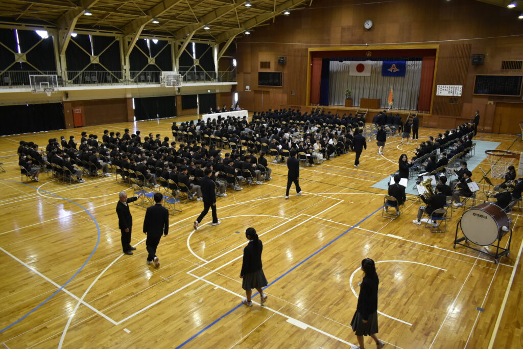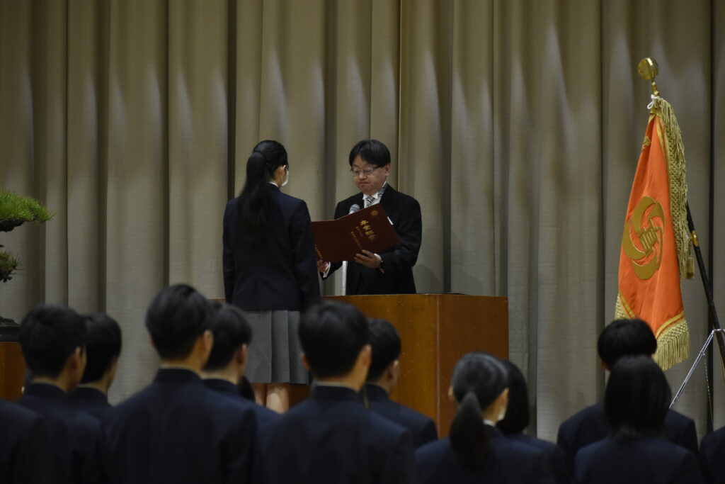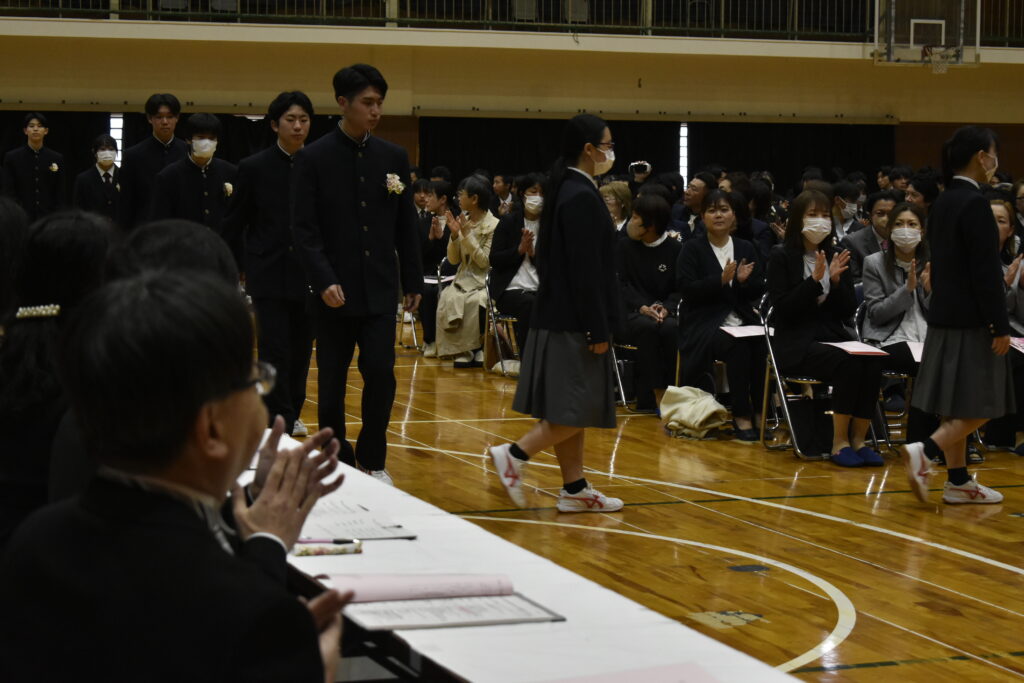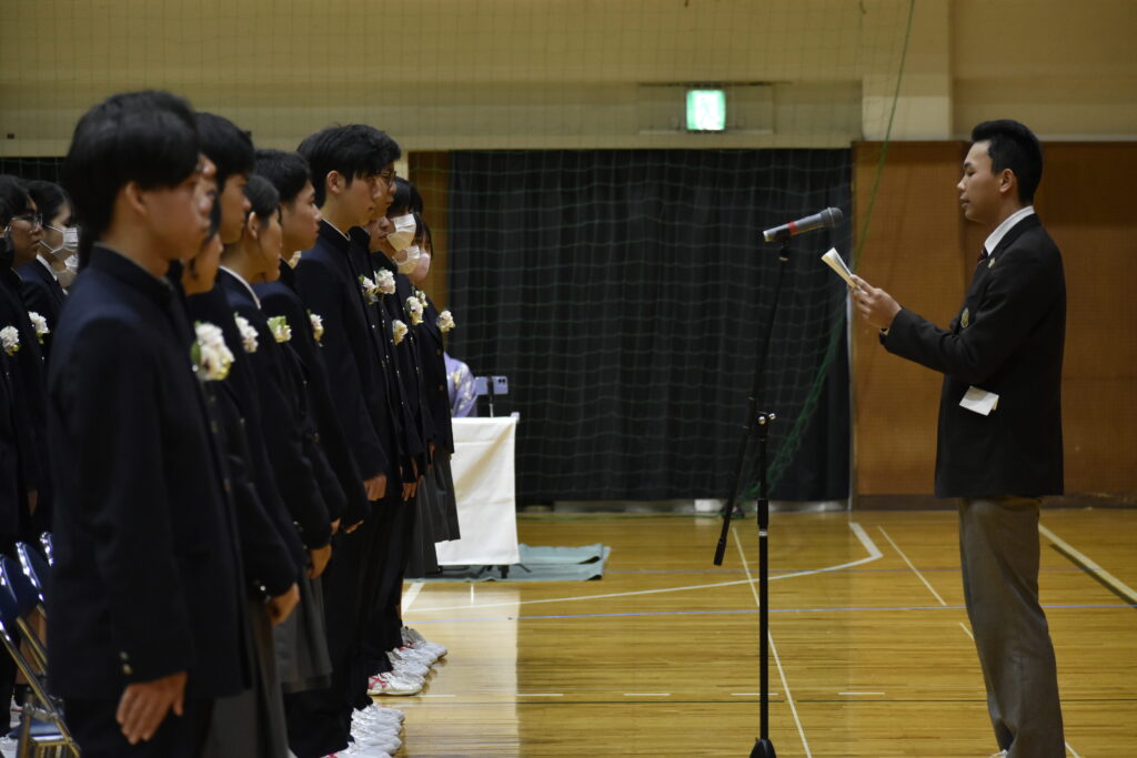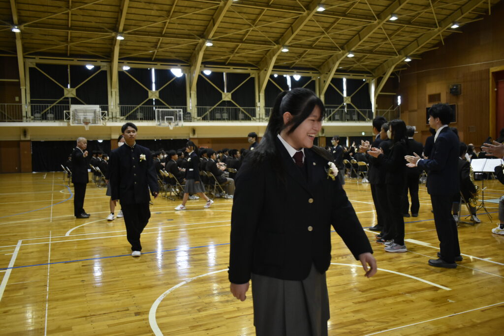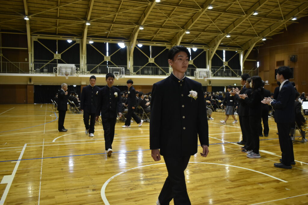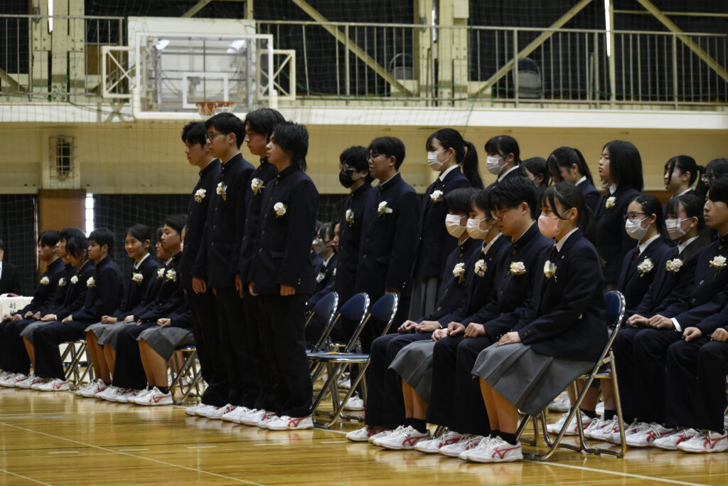 また、本年度の卒業生は、長く親しまれてきた紺色の制服を着用する最後の学年です。新制服である茶色の制服に身を包んだ在校生が、その頼もしい背中から多くのことを学んできました。在校生代表として現生徒会長の2年生が、先輩達への熱い思いを送辞に込め、その気持ちに応えるように卒業生代表で前生徒会長の3年生による堂々とした答辞が見られました。