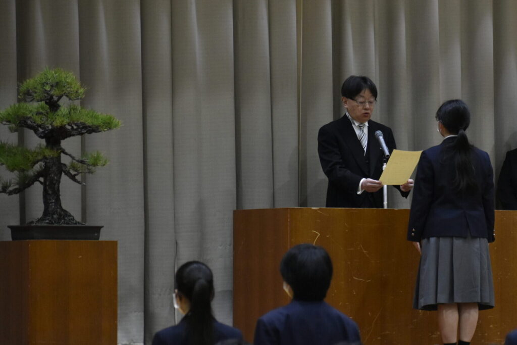 令和8年3月2日(月)に令和7年度卒業証書授与式が挙行されました。春らしい陽気に包まれ、第47期生4クラス72名が晴れて卒業の日を迎えました。卒業証書授与に加えて、皆勤賞の表彰も行われました。本校は高校の中では小規模校ではありますが、その分、校長式辞や祝辞、送辞、答辞の一つひとつにも愛と感謝が込められています。非常に温かみのある式となりました。